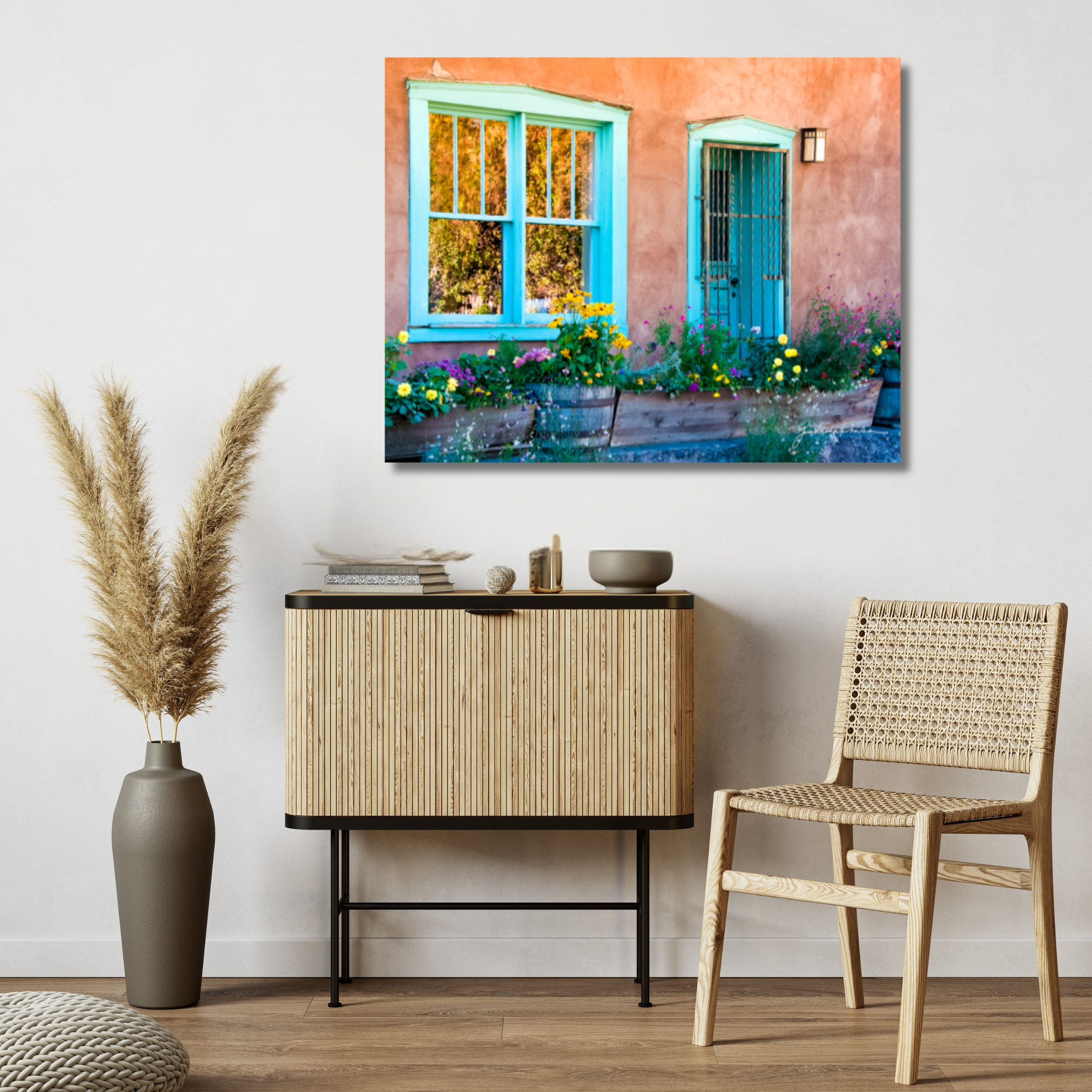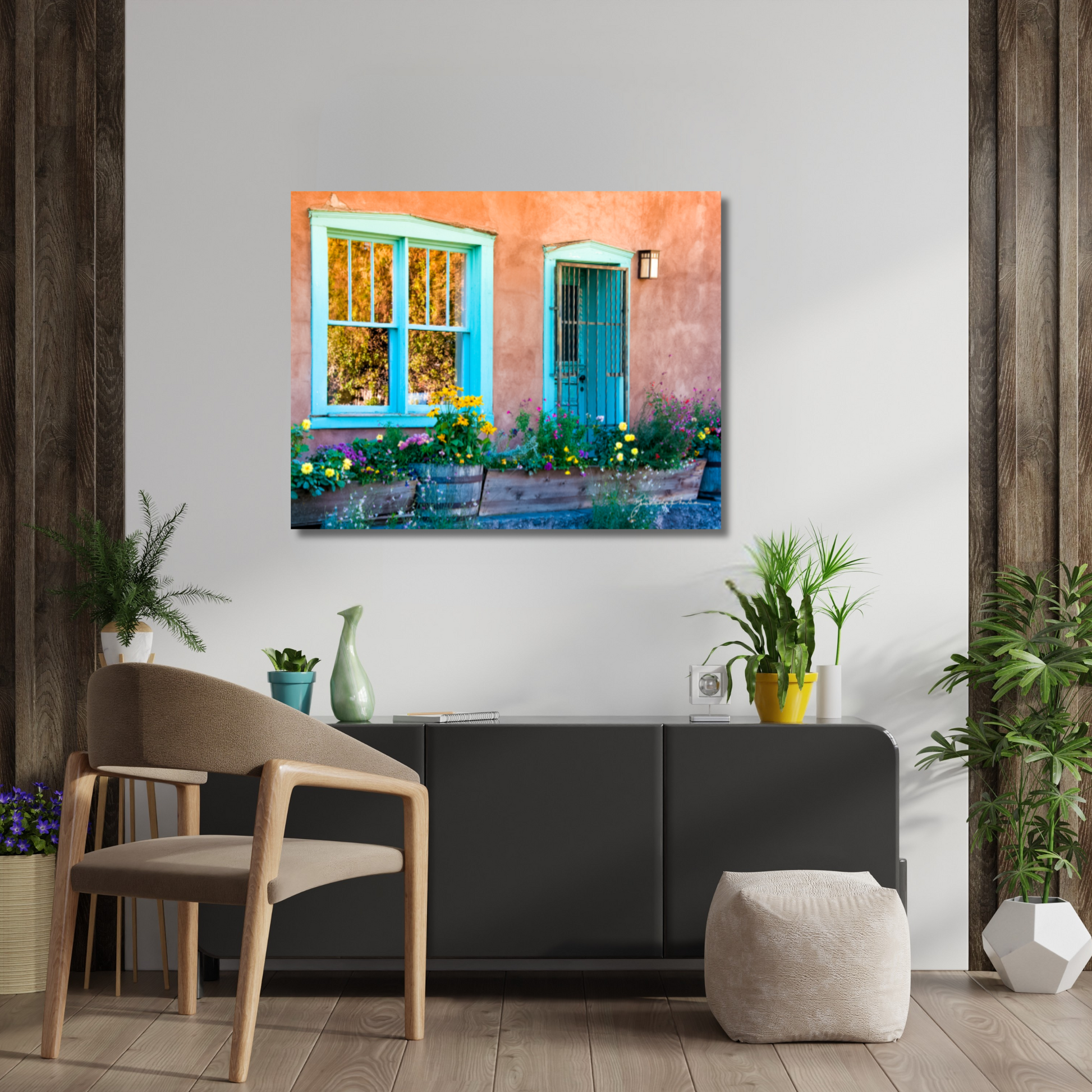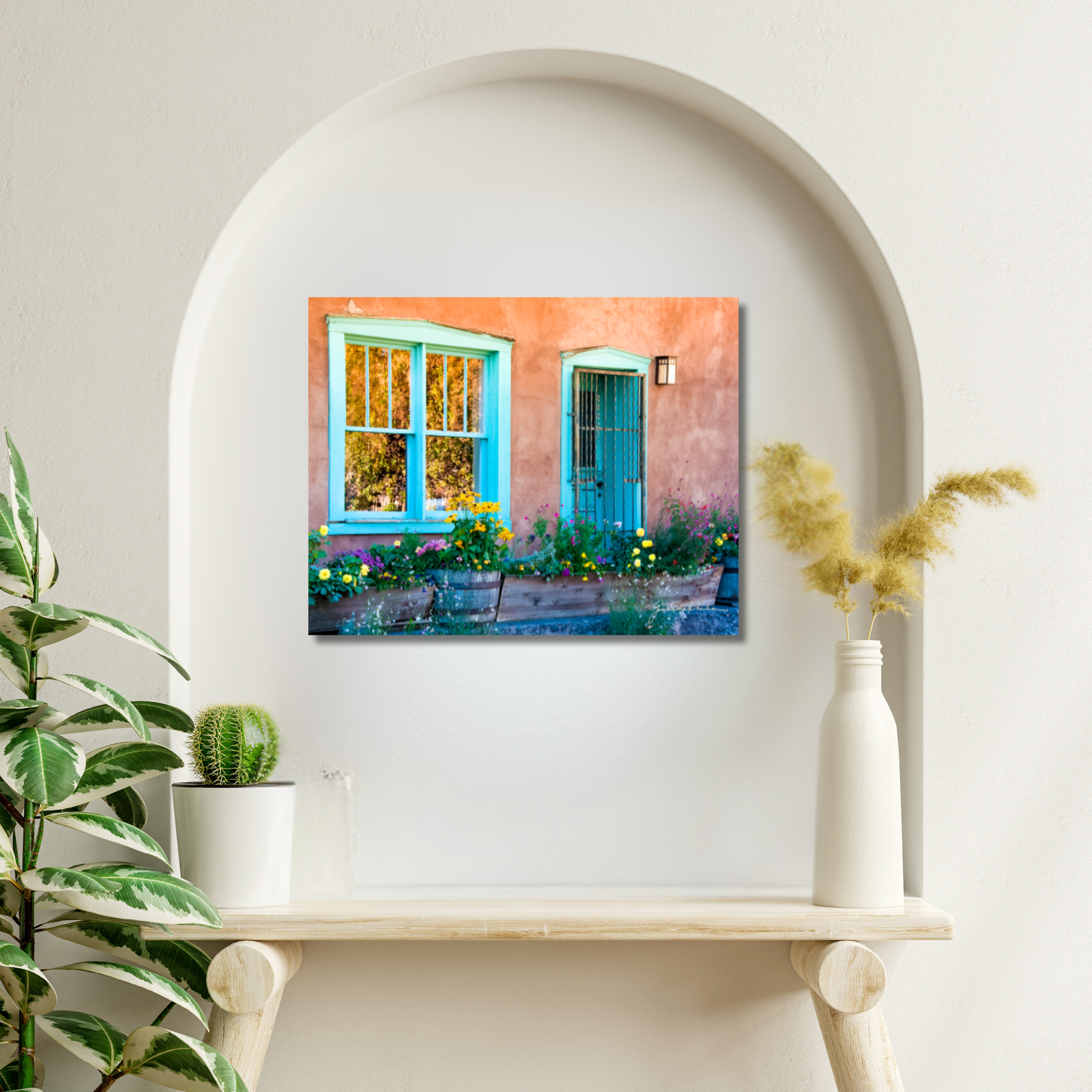 Canyon Road reflects the soul of Santa Fe, where old adobe structures carry the weight of memory while vibrant flowers spill forth with new life. This harmony of opposites speaks to the beauty of resilience—that even in what is weathered and worn, fresh possibility emerges. The scene is a reminder that we, too, carry both the stories of the past and the blossoms of the present, forever living at the crossroads of tradition and transformation.