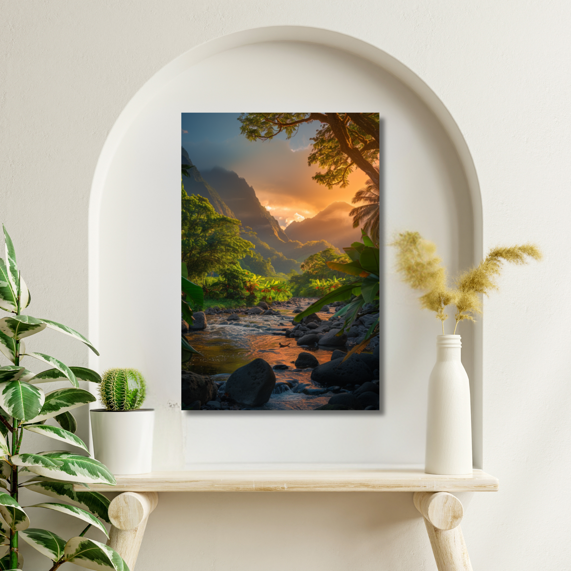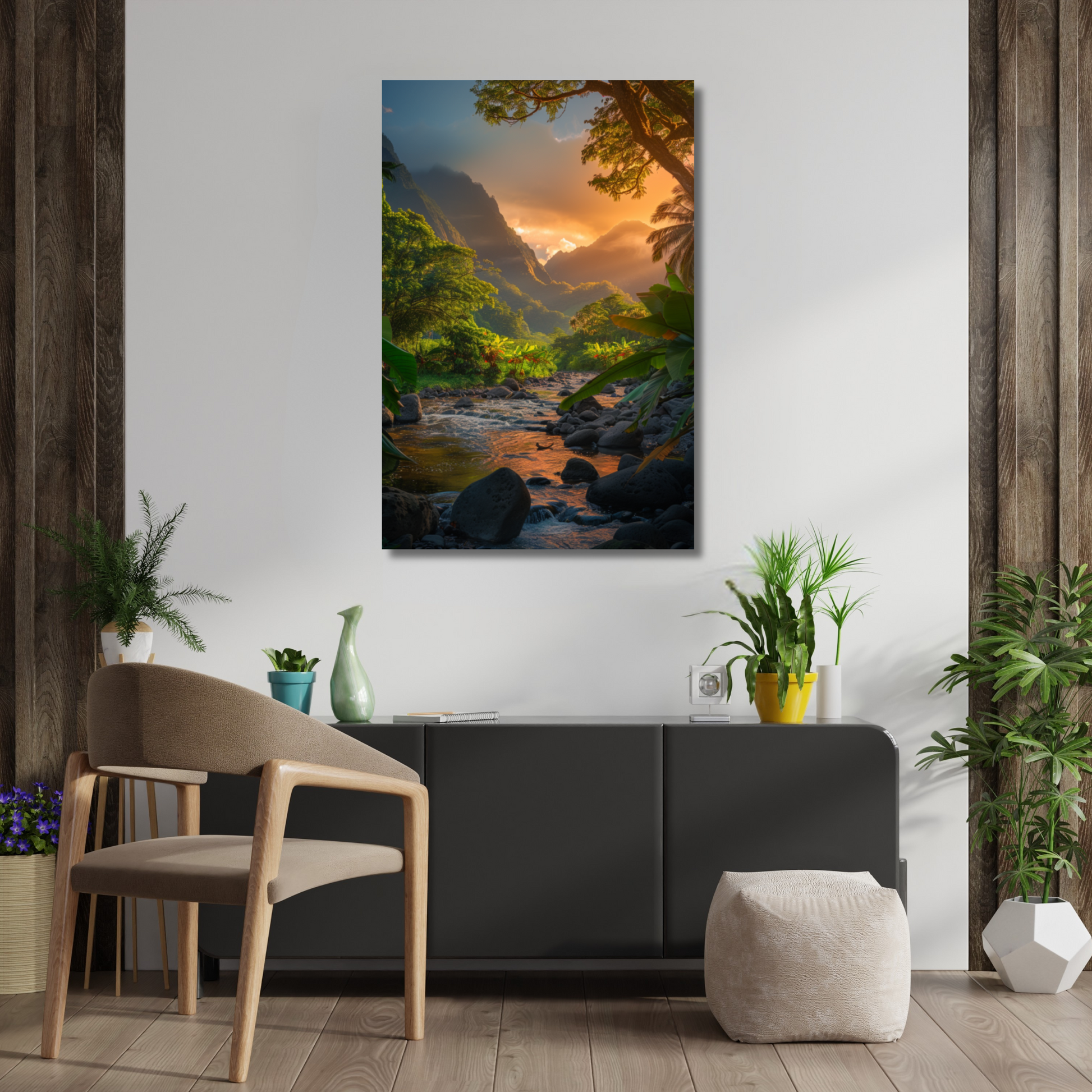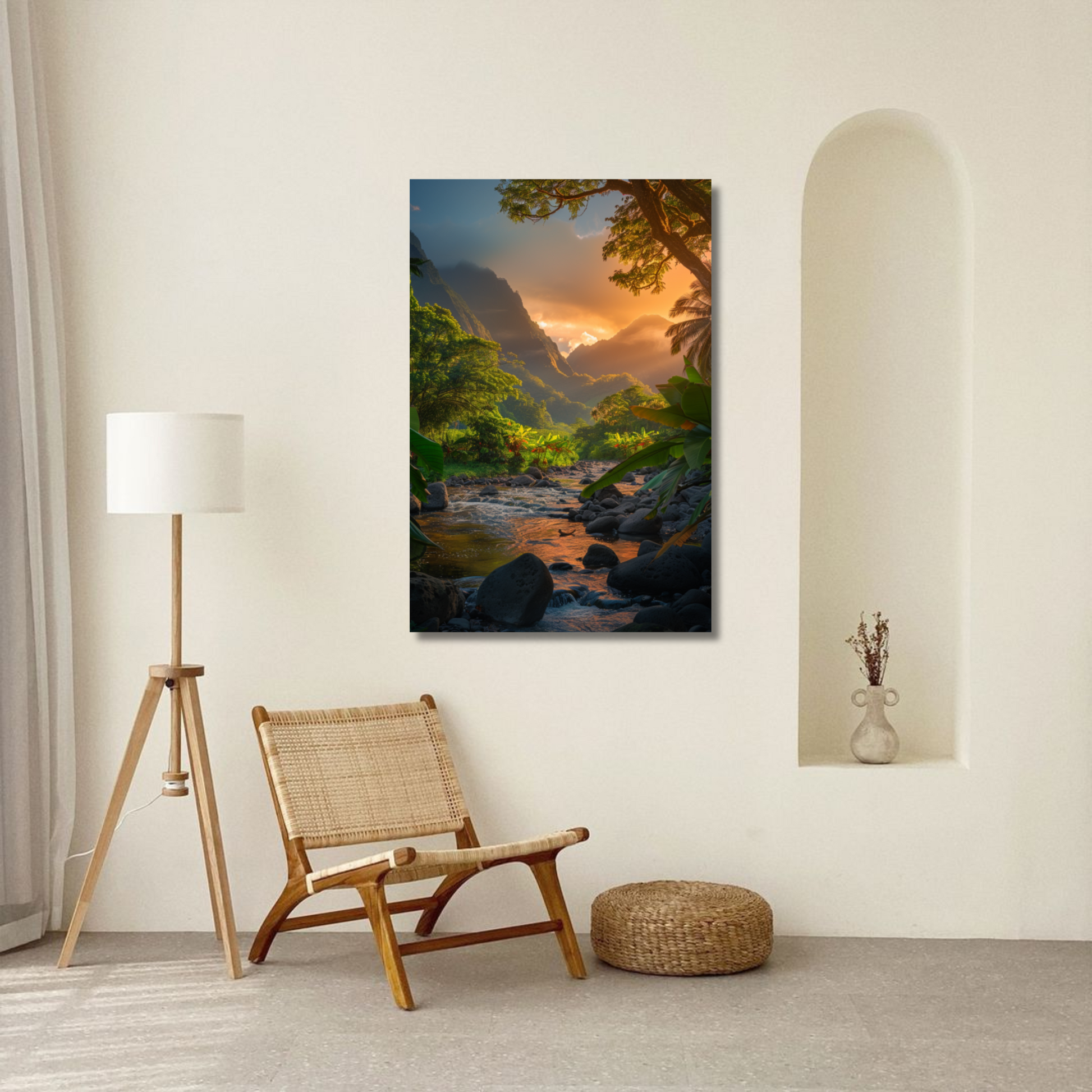 This golden-lit valley, framed by towering peaks and lush greenery, invites you into a sanctuary of balance and renewal. The flowing river reflects the rhythm of life—ever-moving, ever-present, while the sunlight breaking through the mountains reminds us of the light that always returns after shadow. This piece is a call to rest in the embrace of nature, to ground into the earth, and to remember that peace is found not by reaching but by returning to the stillness within.