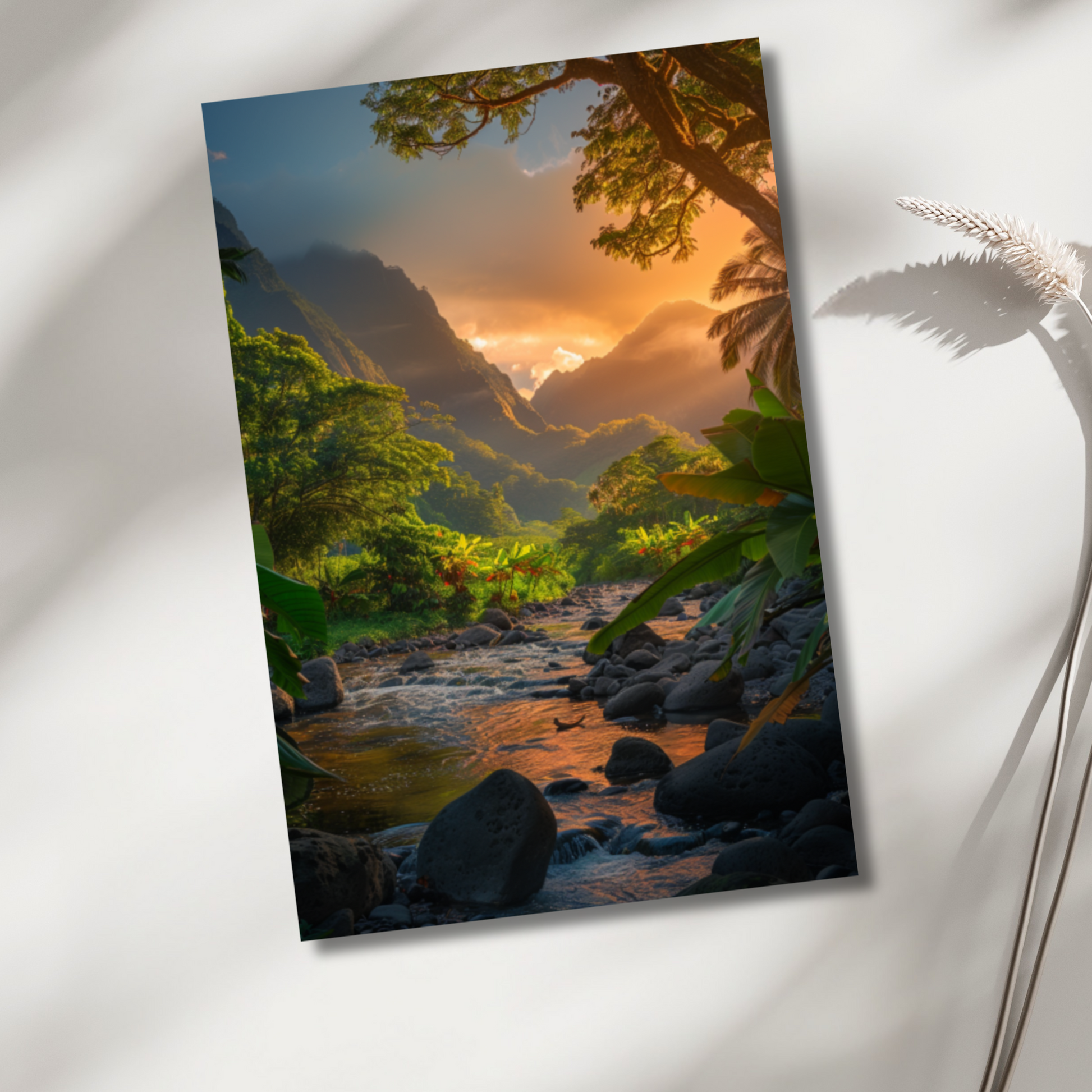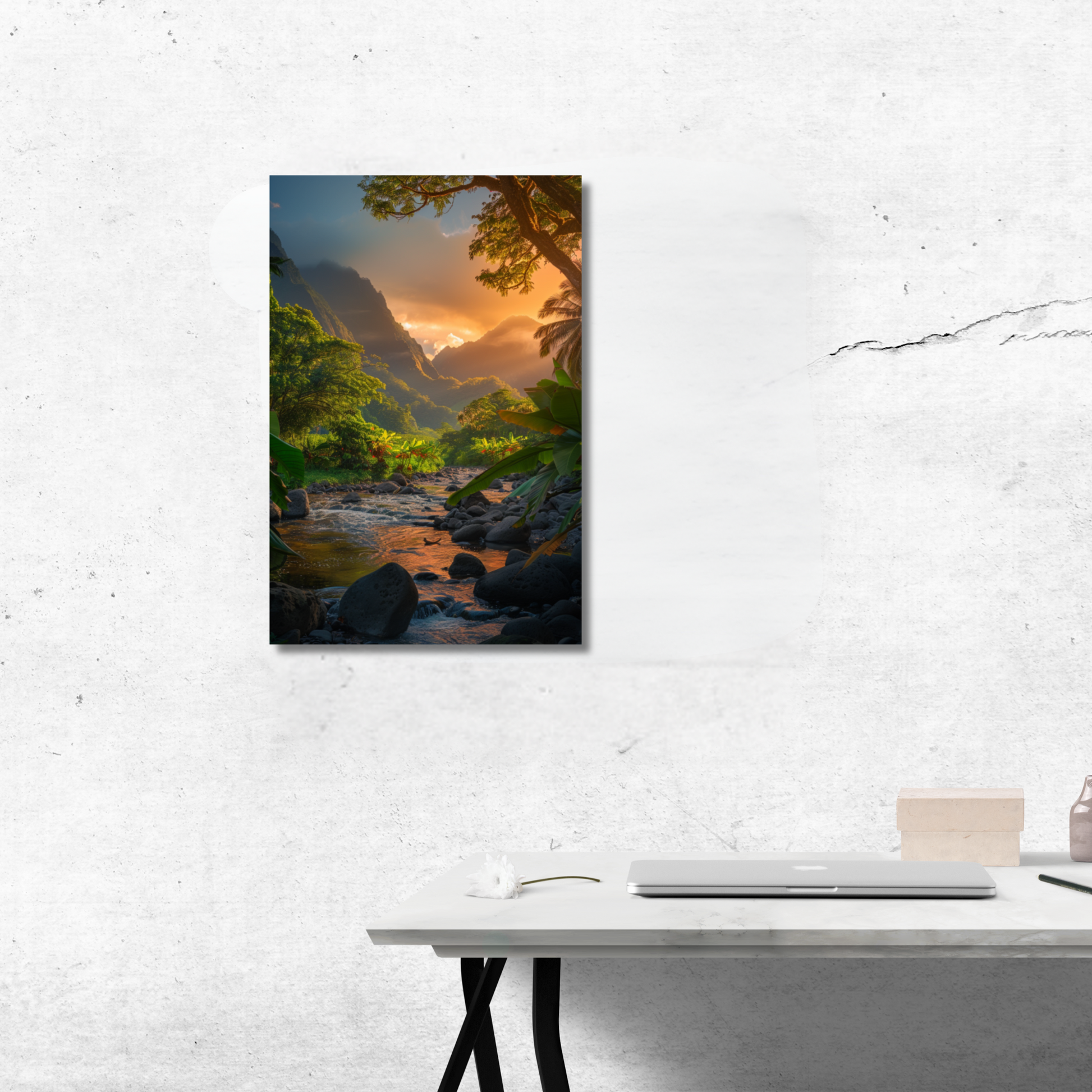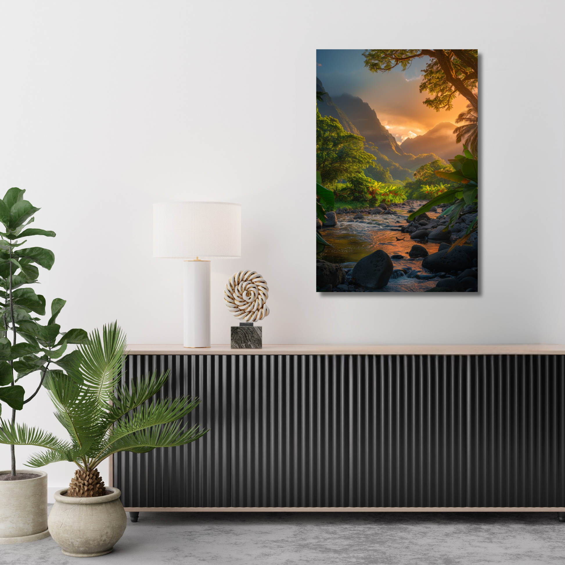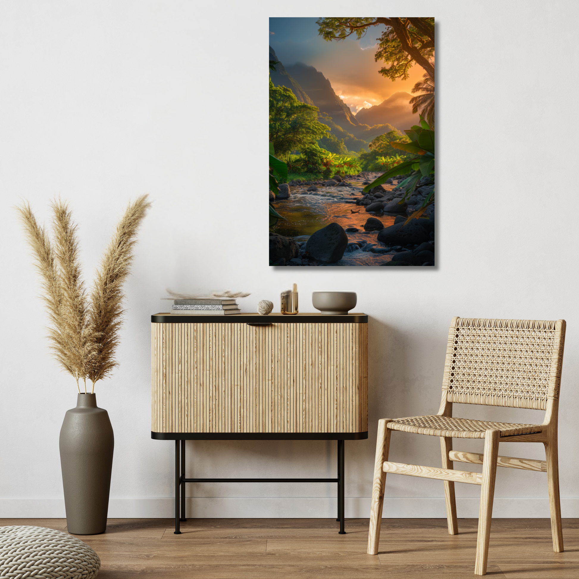 This golden-lit valley, framed by towering peaks and lush greenery, invites you into a sanctuary of balance and renewal. The flowing river reflects the rhythm of life—ever-moving, ever-present, while the sunlight breaking through the mountains reminds us of the light that always returns after shadow. This piece is a call to rest in the embrace of nature, to ground into the earth, and to remember that peace is found not by reaching but by returning to the stillness within.